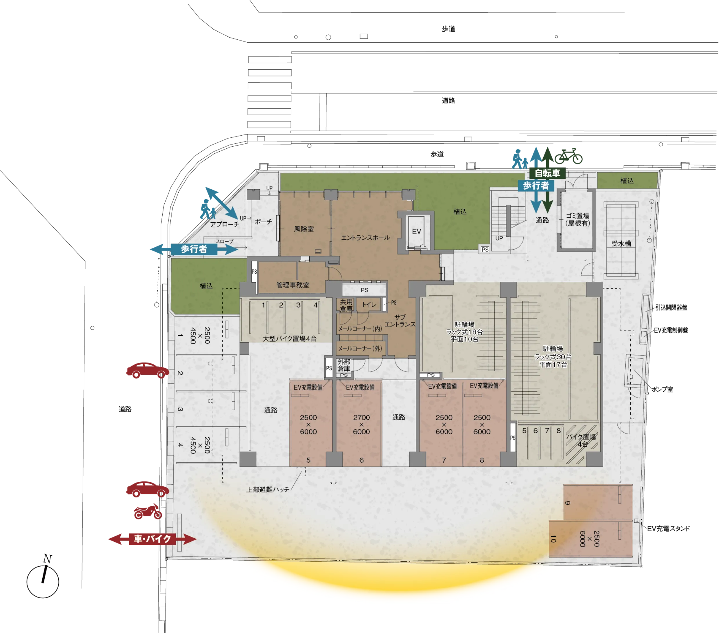 人・自転車・バイク・車の各通路を設けた歩車分離の動線を確保し、安全性に配慮しています。