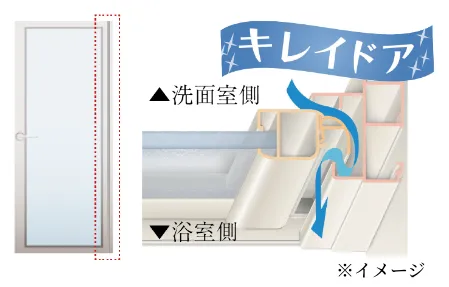 カビやすい浴室側のパッキンをなくし、汚れがたまりやすいドア下部のガラリをタテ型で配置して、汚れにくいドアを実現しました。