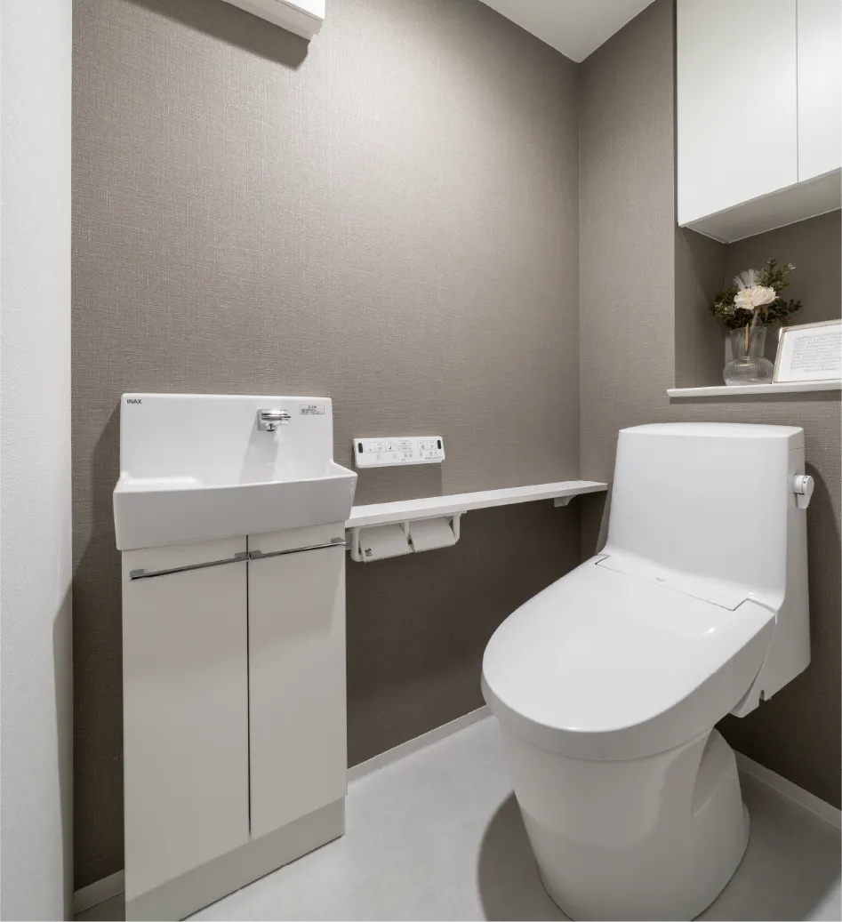 トイレ内に手洗い器を設置することで用を足した後にすぐ手洗いができ衛生的です。また、サッと一拭きでお手入れも簡単です。