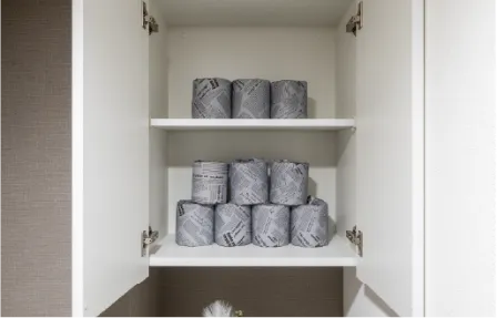 トイレ上部にあるデッドスペースを有効利用し、スッキリとした空間に。トイレットペーパーのストックなどに使えます。