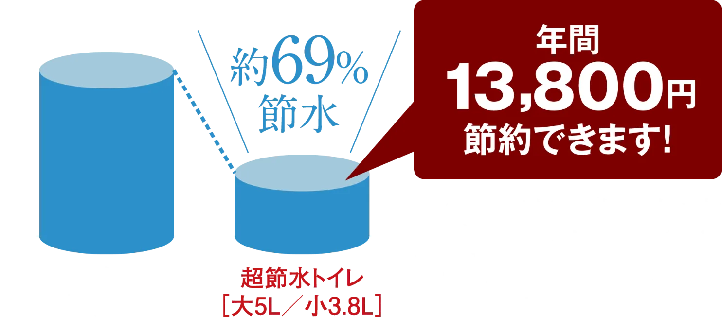 大洗浄5L、小洗浄3.8Lの「超節水ECO5トイレ」。従来品(大13L)と比べ、約69%の節水を実現。