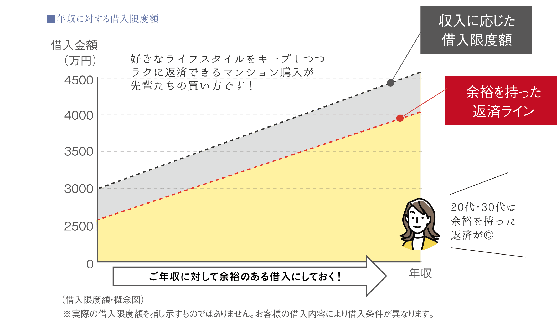 - 住宅ローンをギリギリまで借り入れて憧れのマイホームを手に入れたけど、毎月のローン返済で家計は火の車。そんなのはもう昔の話です。今の賢い20代・30代の人達は、限度額まで借りず、ムリなく返済できる金額だけを借りるのが常識。家計に余裕があるから、趣味や家族旅行を思いきりエンジョイできます!