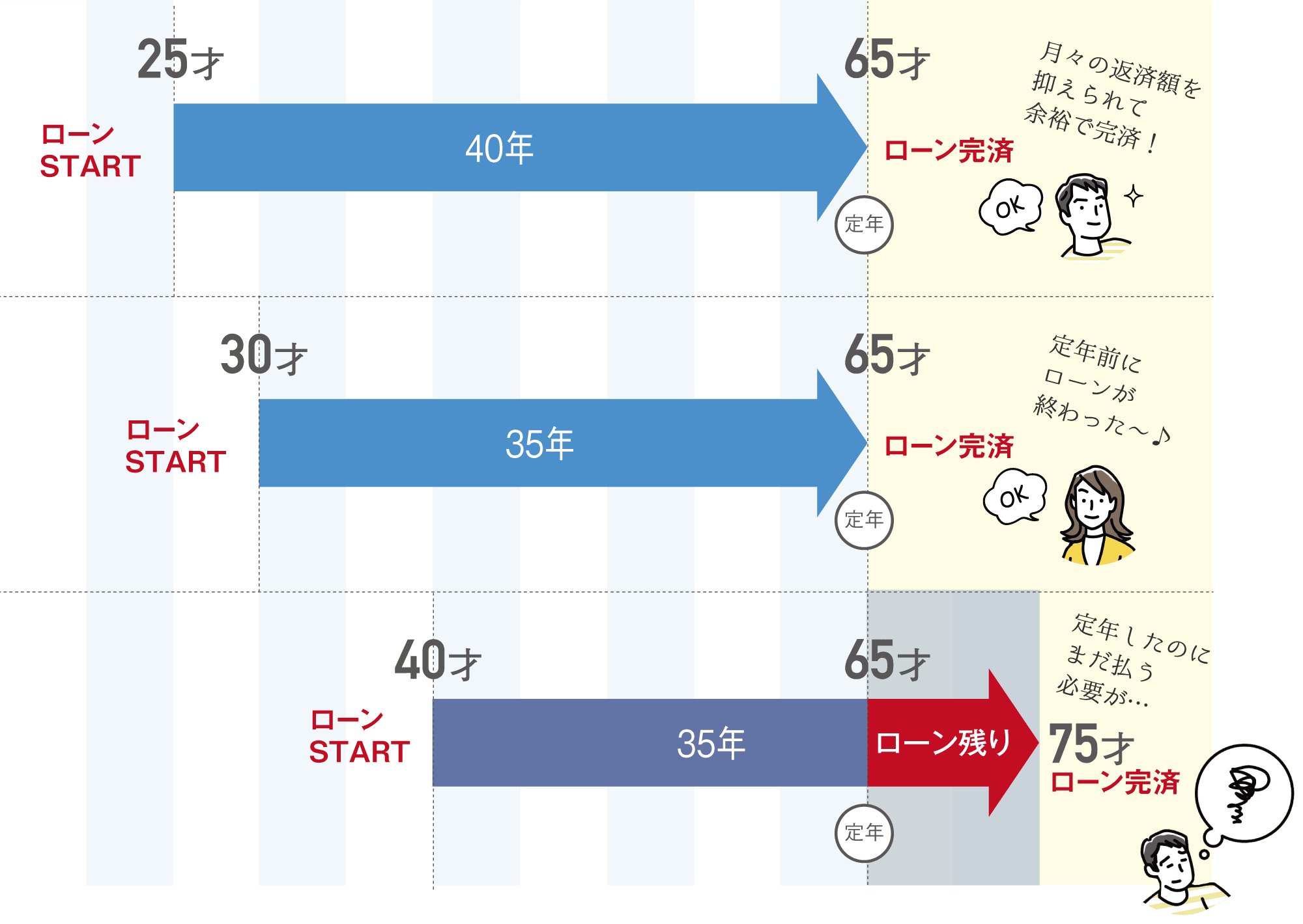 - 今のあいだにきちんと考えておかないと、購入が何十年も先になる可能性があります。年齢が上がってしまうと35年ローンを組んだ場合、完済が定年後になってしまいます。定年後は年金だけの収入となり、ローンの返済が厳しくなります。そのためローン期間を短くすると毎月の返済額が高くなってしまい、家計への負担が重くなってしまいます。そのため、マイホームはなるべく早く購入するほうが負担は軽くなるのです。