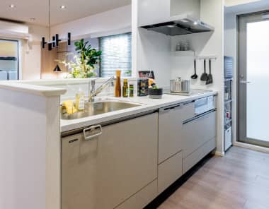 キッチンとバルコニーを行き来できる勝手口があるから、お料理中に急な雨で洗濯物を取り込む時も便利だし、ゴミの仮置きもできるから匂いも気にならずかなり重宝。